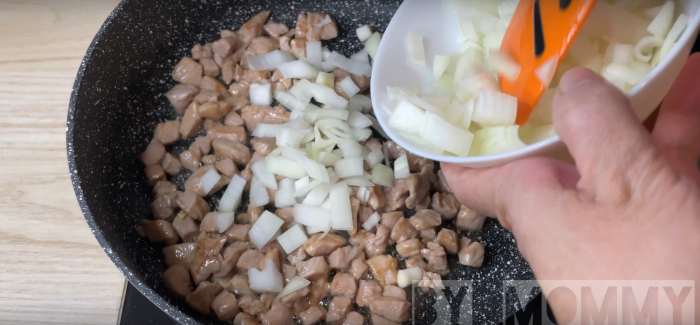 7) Как только мясо приготовится, убавляем огонь на средний и выкладываем репчатый лук, всё хорошо перемешиваем. Обжариваем не больше 2 минут.