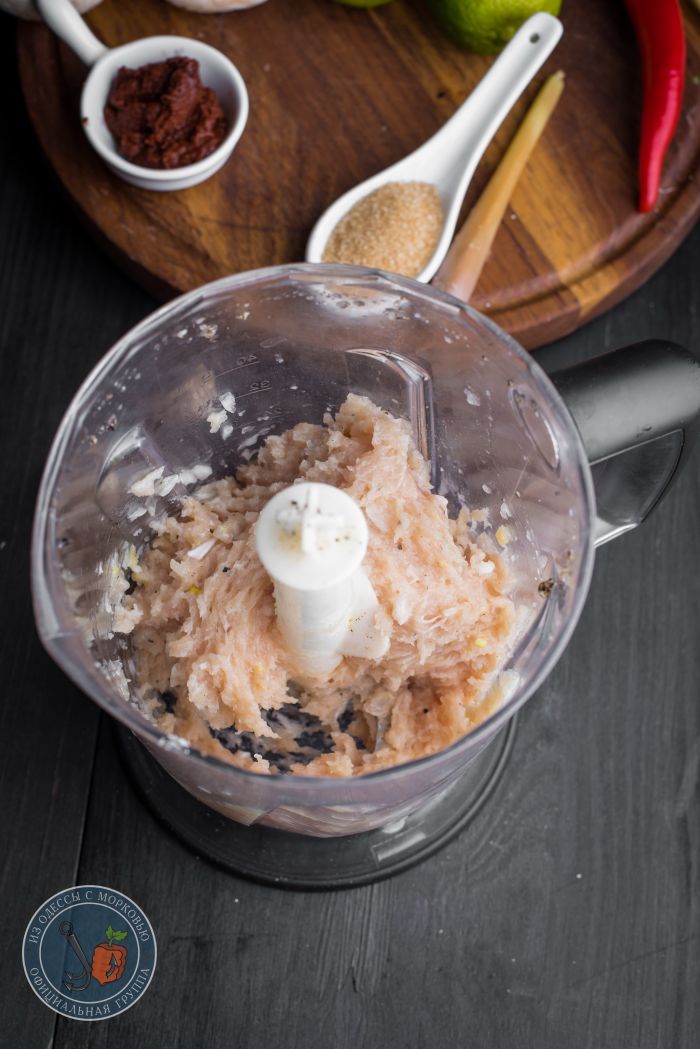 - Закинуть филе, лук, имбирь и яичный белок в чашу блендера и перебить все до однородного состояния без текстуры. Если блендера под рукой нет, все можно перекрутить в мясорубке. При желании все можно просто тщательно порубить ножами на доске, но мне нравится более гладкая текстура фрикаделек и блендер с мясорубкой дают мне такой результат за одну минуту. Готовую смесь приправить солью