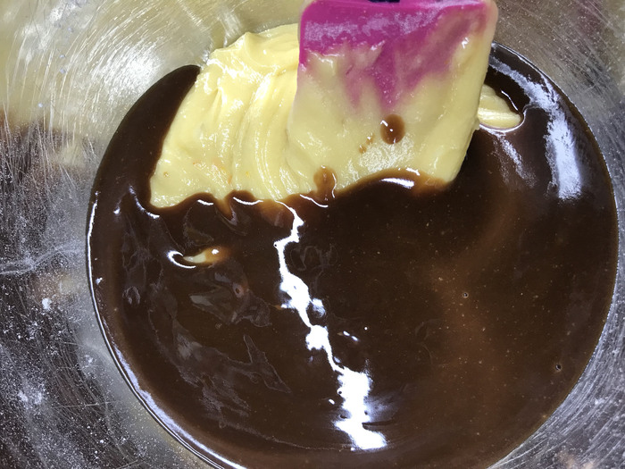Включаем духовку на 180 градусов. К этому времени шоколад уже почти остыл. Добавим его в одну из чаш с тестом.