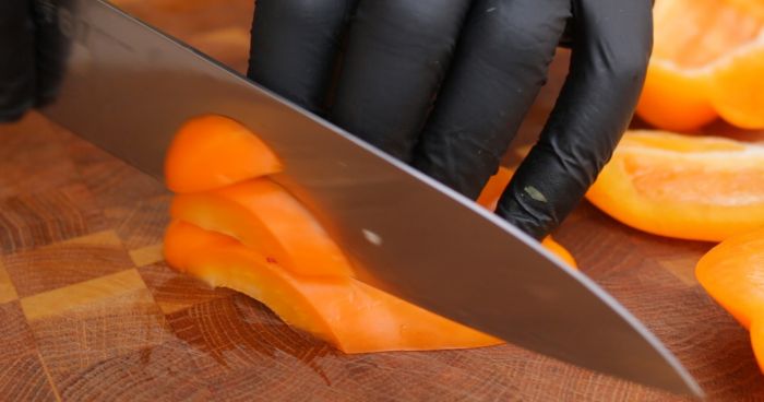 Пока мясо маринуется займёмся овощами. Болгарский перец очищаем от плодоножки и семечек. Нарезаем его полосками. Головку фиолетового лука среднего размера нарезаем полукольцами. Баклажан нарезаем сначала не толстыми кружками. А затем разделяем их на полоски. От спаржи отделяем нижнюю часть из-за того, что она достаточно жесткая. А нежную верхушку разрезаем на 3-4 части. Бейби кукурузу нарезаем на кусочки длинной 2-3 см. Зубчики чеснока придавливаем широкой стороной ножа, а затем мелко нарезаем.