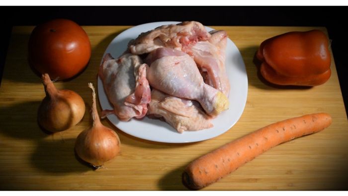 Нарезаем ножки и обжариваем их с двух сторон до румяной корочки. Режем лук, перец и морковь. Достаём курятину из кастрюли, а на её жирное и нагретое место отправляем нарезанные овощи.