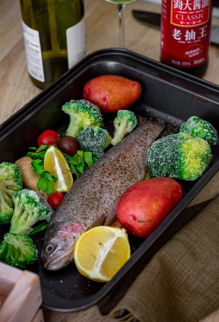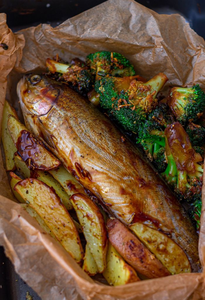 Теперь выкладываем все в конверт из пергамента, смазываем рыбу соусом унаги и ставим запекаться в разогретую до 180С духовку минут на двадцать, до готовности рыбы, гарниры то у нас по сути готовы. И не забывайте периодически доставать рыбу и смазывать ее соусом, чтобы получилась глянцевая глазурь.