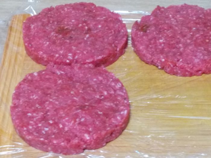 Смешайте говяжий фарш и смесь специй для бургеров. Сформируйте котлеты, уберите в холодильник.