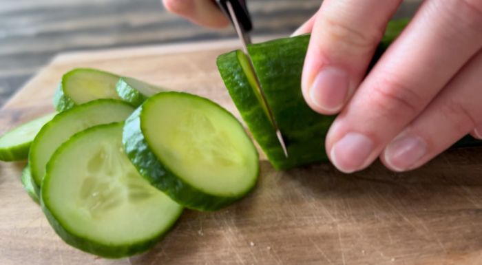 Свежий огурец тоже режем кружочками. Важно, чтобы они были примерно одного размера с хлебом.