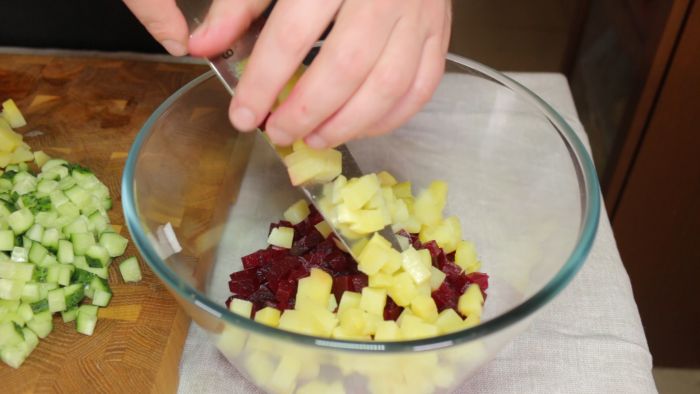 Очищаем головку лука и мелко её нарезаем. Огурец нарезаем некрупным кубиком со стороной равной примерно пол сантиметра. 2 клубня вареного картофеля нарезаем точно таким же кубиком. Тоже самое делаем с вареной свеклой. Важно постараться нарезать овощи кубиком максимально похожего размера. Это сделает салат более однородным и приятным по консистенции. Порезанные овощи отправляем в глубокую миску.