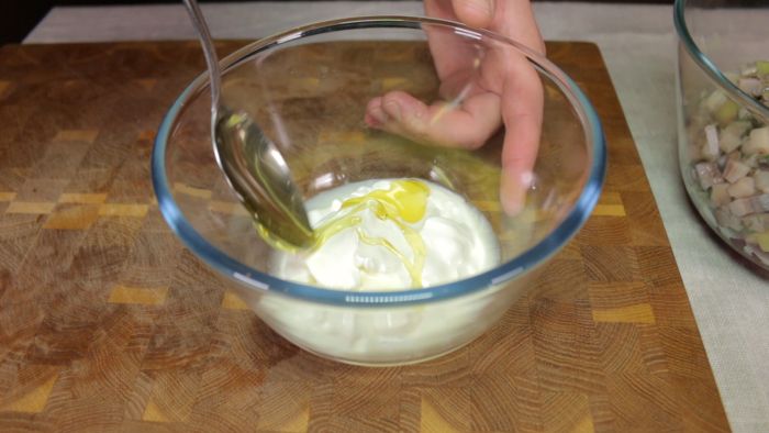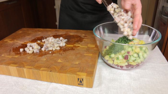 Туда же отправляем небольшой пучок мелко нарезанного укропа. Филе сельди в количестве 200 гр нарезаем кубиком со стороной полсантиметра, как и овощные составляющие салата. Перекладываем сельдь в миску к остальным ингредиентам.