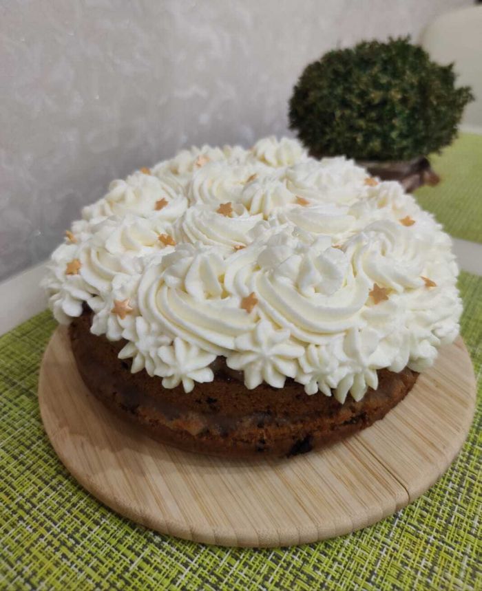 Крем выложить в кондитерский мешок и отсадить сверху пирога. Пирогу дать настояться в холодильнике несколько часов.