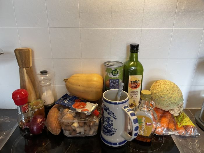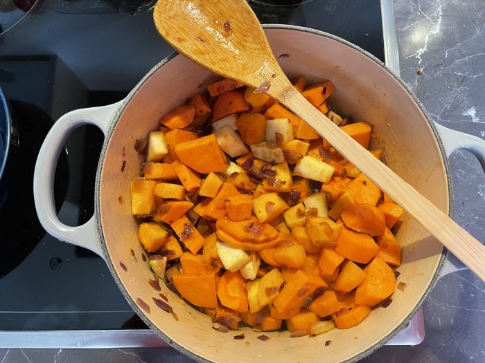 Нарезать кубиком морковь, батат, тыквы и сельдерей. Добавить к луку и хорошенько обжарить.
