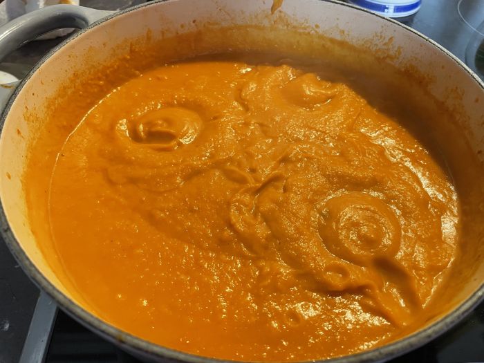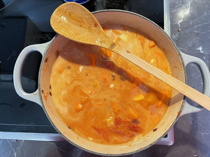 Далее заливаем кокосовое молоко, томаты из банки, томатный концентрат. Приправы и кленовый сироп. Так как я люблю острое, то кленового сиропа и острых специей вышло больше, чем в рецепте.