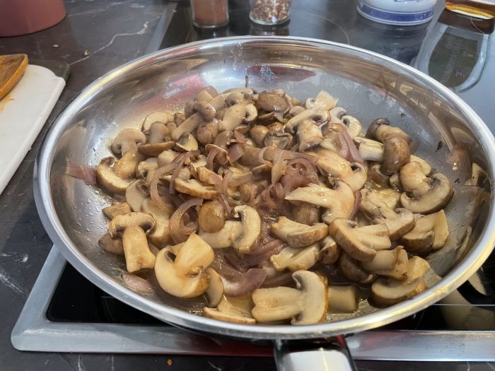 Нарезаем грибы кружочками и лук полукольцами. Быстро обжариваем на масле и сильном огне. Снимаем и отставляем в сторону. Их надо будет выкладывать поверх риса и карри.