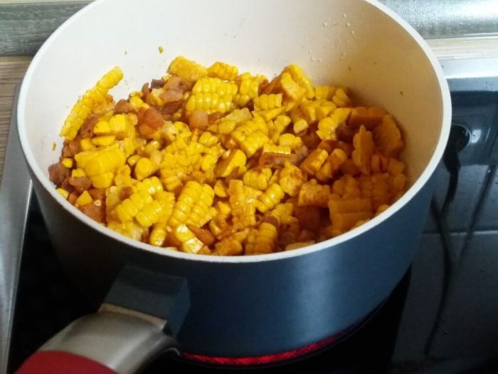 Нагрейте сковороду, обжарьте бекон до хрустящей корочки и переложить на бумажные полотенца. Жир слейте, оставив в сковороде 1 ст.л. Всыпьте в сковороду зерна кукурузы, бекон, копченую паприку, соль, черный перец. Теперь жарьте 5 минут.