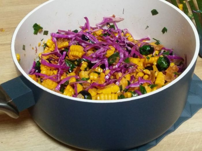 Для начала нарежьте бекон, лук и базилик. Капусту тонко нарежьте. С початка срежьте зерна кукурузы.