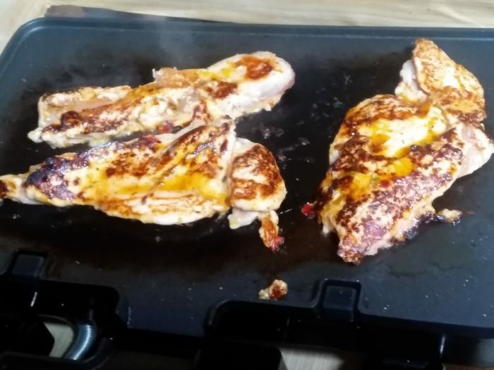 Отбейте немного филе. Затем смешайте все ингредиенты для маринада, залейте курицу большой частью маринада (оставить на смазку) и оставьте на 30 минут (или можно убрать в холодильник на 2-3 часа).