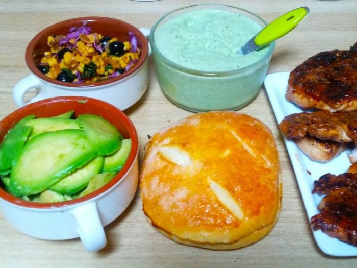 Авокадо нарежьте. Верхнюю булочку смажьте небольшим количеством соуса, на нижнюю булочку выложите соус, сверху курицу, кукурузный релиш и ломтики авокадо. Накройте верхней булочкой.