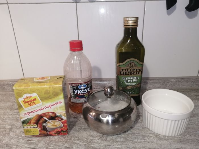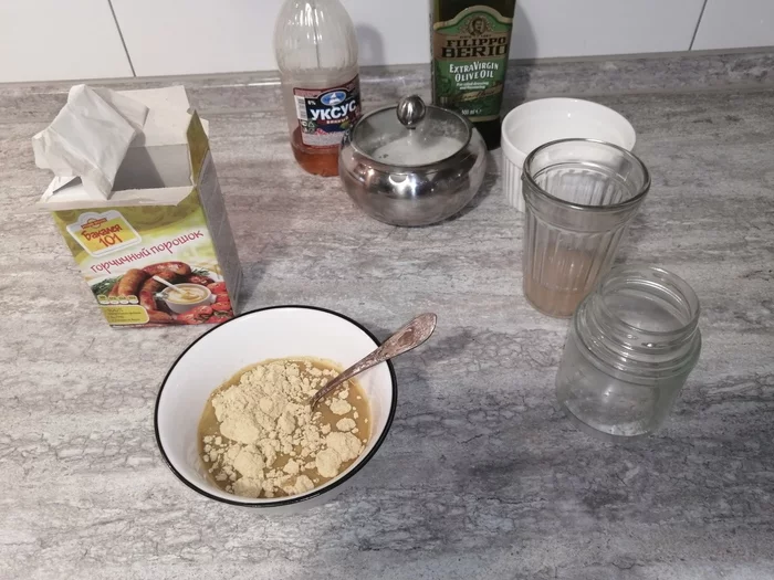 Необходимые ингредиенты. Горчичный порошок, винный уксус, оливковое масло, сахар.