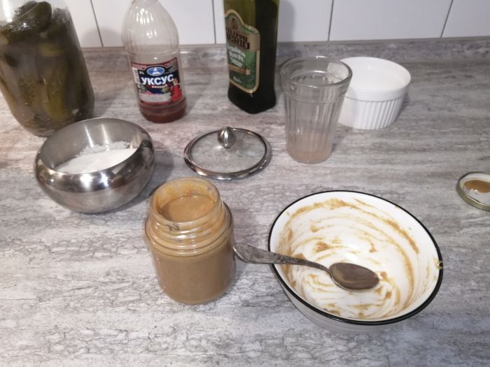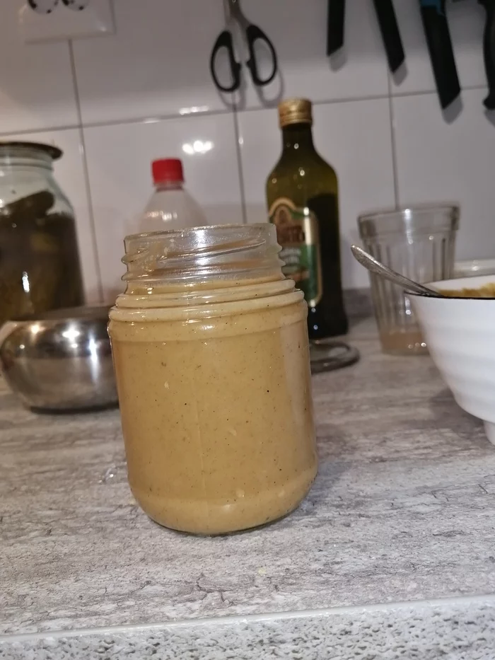 У меня получается такая банка горчицы. Закрываю крышкой и ставлю в теплое место на часов 10-12. В моем случае это батарея. Горчица в тепле наберет крепости, получится достаточно жесткая, ароматная , и вкусная приправа.