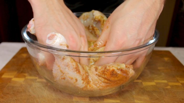 Помещаем курицу в глубокую миску, чтобы замариновать. Добавляем к ней 2 ч.л. сладкой паприки, 2 ч.л. гранулированного чеснока, свежемолотый перец и соль по вкусу, а также добавляем немного растительного масла, чтобы специям было проще раскрыться. Распределяем специи равномерно по всей поверхности голеней и оставляем курицу немного помариноваться.
