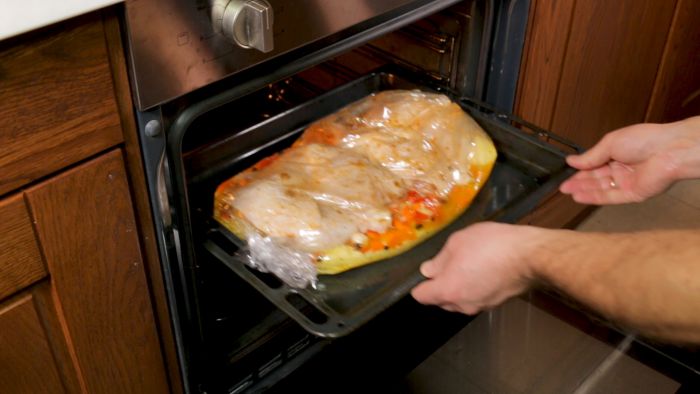 В рукав для запекания помещаем 500 гр риса. Заливаем 600 мл воды. Также в рукав отправляем репчатый лук, болгарский перец и морковь которые мы подготовили в начале рецепта. По специям добавляем 2 ч.л. соли, 1 ч.л. куркумы, 1 ч.л. зиры и пол горсти ягод сушеного барбариса. Перемешиваем содержимое рукава. Затем берём куриные голени и укладываем их в рукав для запекания поверх его содержимого и завязываем рукав с обратной стороны. Зубочисткой прокалываем в рукаве несколько отверстий, чтобы он не лопнул во время приготовления.