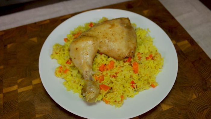 По прошествии указанного времени у нас получается полный, ароматно пахнущий рукав очень вкусной еды. С сервировкой блюда никаких тонкостей нет. Просто выкладываем на тарелку рис с овощами. Сверху кладём куриную голень и подаём к столу. Приятного аппетита!