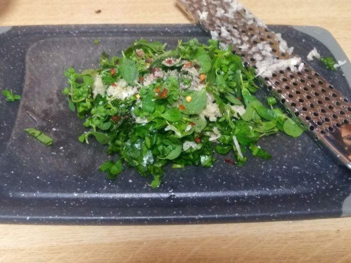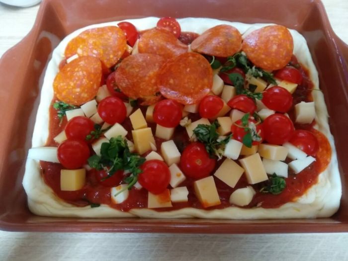 Форму обильно смажьте оливковым маслом, выложите тесто и растяните до углов, расстойка 30 минут. Тем временем, в миске смешайте натертый чеснок, нарезанный базилик, орегано, семена фенхеля, хлопья чили, соль, черный перец.
