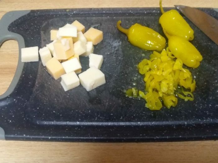 Теперь нарежьте пепперончини. Нарежьте кубиками сыры.