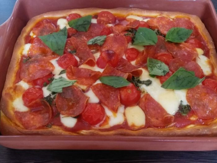 Детройтская пицца (Detroit style pizza)- прямоугольная пицца с томатным соусом, пепперони, сыром из Висконсина и моцареллой, выпекаемая в прямоугольной форме. Такой стиль был разработан в середине 20-го века, в Детройте. Является одним из самых знаковых блюд Детройта.