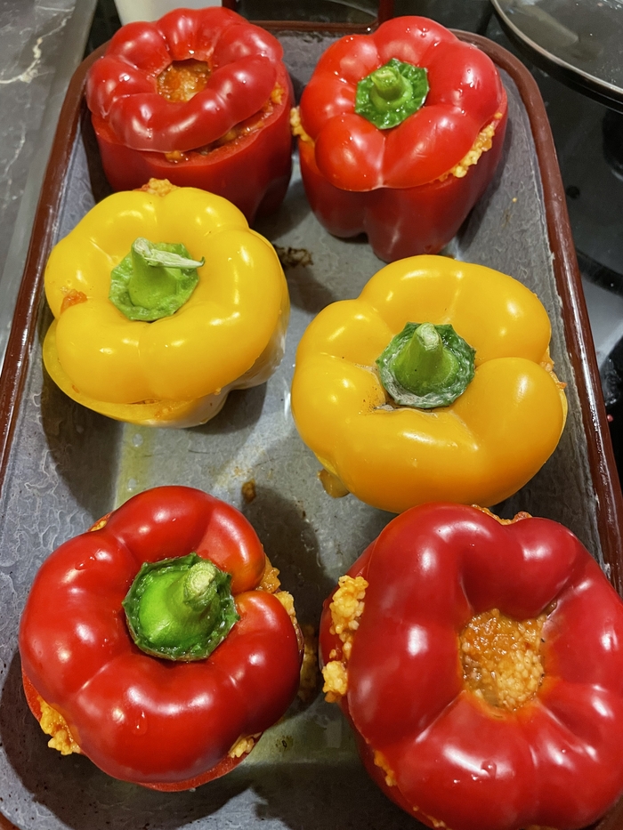 Начинить этим перцы и поставить в разогретую духовку. 200 градусов на 30 минут.