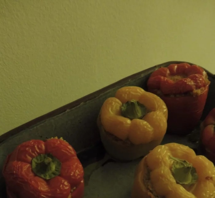 У нас с женой бывают периоды, когда надоедает есть мясо/мясную продукцию. Ну вот прямо не лезет кусок в горло. Мы тогда можем 1-2 недели совсем без мяса обходиться. Вот снова настал такой момент и мне захотелось приготовить что-то новенькое. А потом возникла идея: недавно крёстная готовила фаршированные перцы. Было вкусно. Что если убрать оттуда мясо?