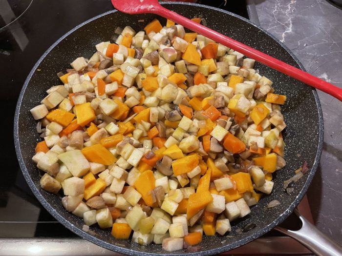 Все овощи мелко нарезать и обжаривать на масле и сильном огне.