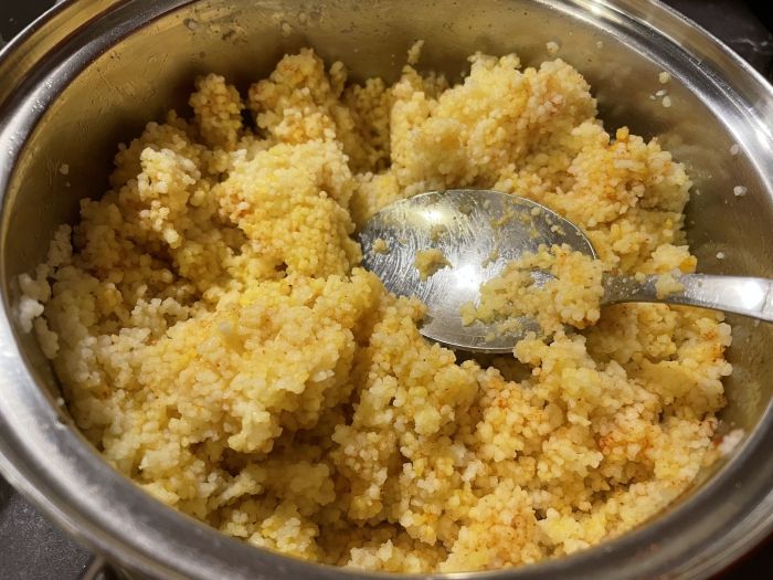 Кускус залить кипятком и после приправить специями. Смешать с овощами из сковороды.