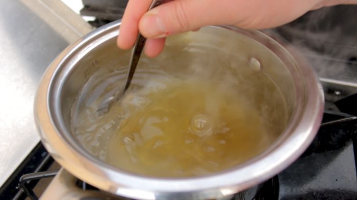 Ставим кастрюлю на огонь. Заливаем в неё 1 литр воды и доводим до кипения. В кипящую воду добавляем 150 гр сахара и 150 мл меда. Перемешиваем ингредиенты, пока они полностью не растворятся.