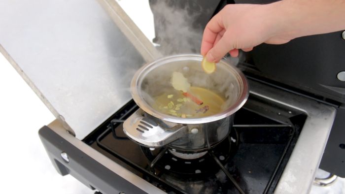 После растворения мёда и сахара добавляем 1 лавровый лист, половину палочки корицы, 5 соцветий гвоздики, 1 ч.л. кардамона и кусочек имбиря примерным весом 5гр.