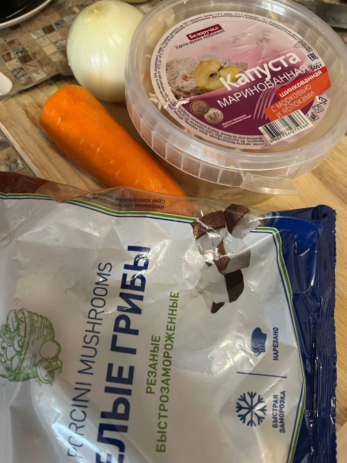 Лук, морковь, кусочек филе говядины. Капуста, лучше квашенная. Варенный картофель. На последнем я остановлюсь подробнее позднее.