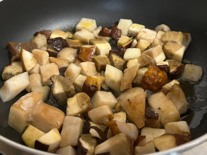 Итак, пассируем лук с морковкой, на соседнюю сторону на высокий огонь идет еще одна большая. Фактически, вся готовка будет происходить там. Каплю масла, высокий жар, закидываем грибы. Нам нужна на них корочка красивая.