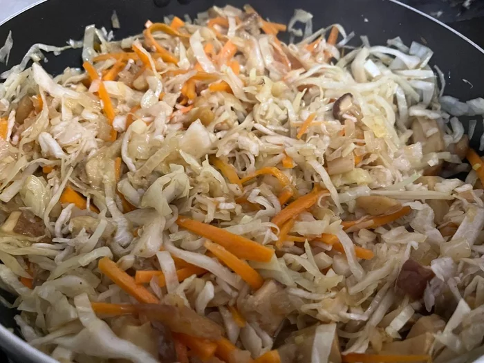Т.к. потом они пойдут в суп, чтобы не превратились в месиво. Обжарили, докидываем туда капусту квашенную, я докинул свежей еще.