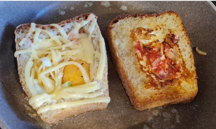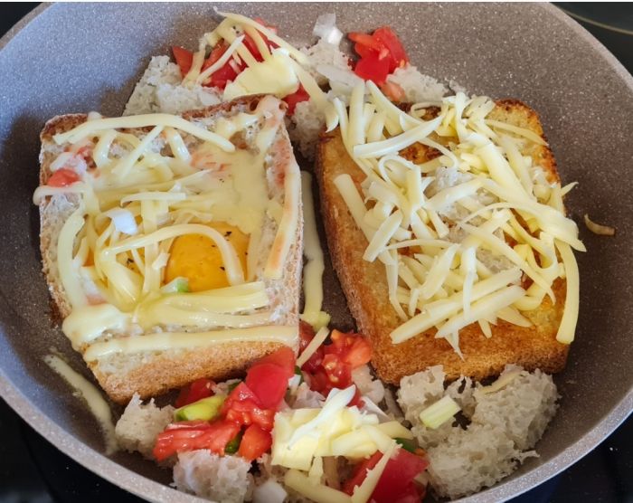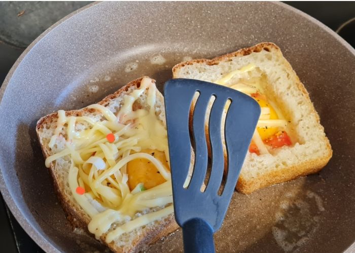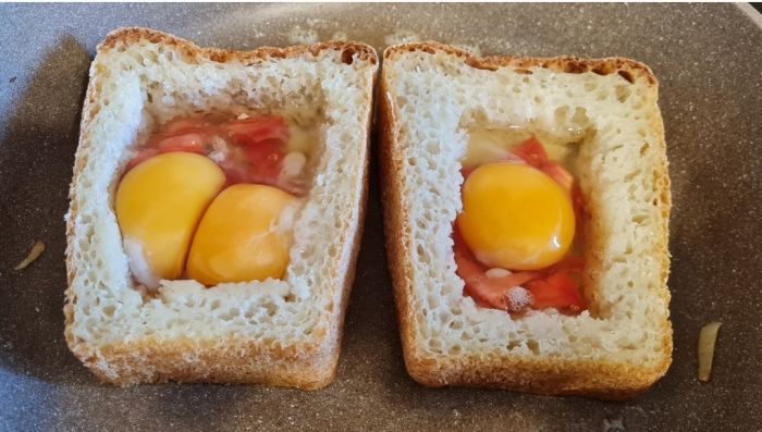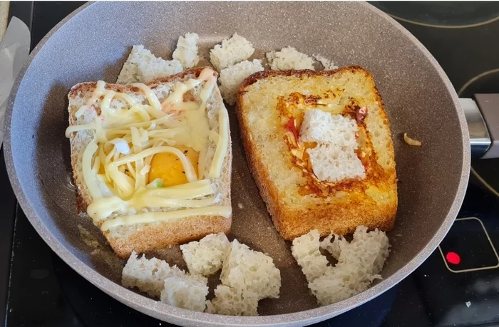 Итак, вылили яйца, стараясь чтобы не вытекли с хлеба на сковороду. Если всё же вылилось, ничего страшного - подбираем и кладём обратно уже поджаренное. Если наоборот, слишком мало и яйцо оказалось где-то "на дне", то добавляем 2-3 кусочка мякиша.
