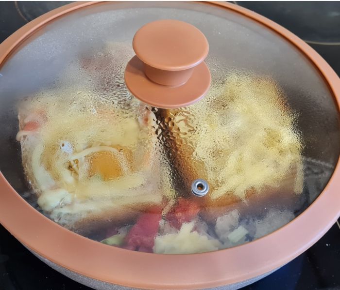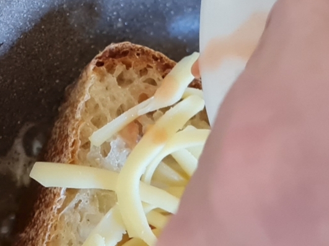 Добавляем сыр и закрываем крышкой на 2-3 минуты, чтобы начал плавиться сыр. Готовимся перевернуть хлеб: