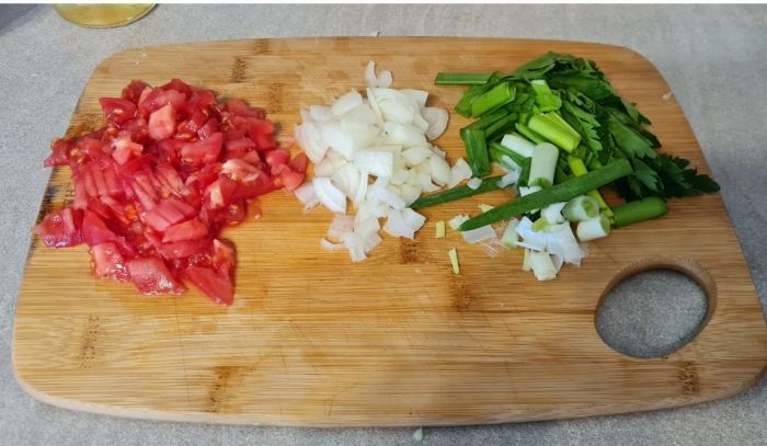 Лук и зелень нарезаем средне, помидор - супер мелко. Выкладываем помидор в отдельную ёмкость - от него понадобится сок.