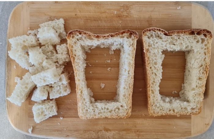 В хлебе вырезаем отверстия - побольше для двух яиц и поменьше для одного. Вырезанный мякиш не убираем - рубим мелкими кусочками и оставляем рядом, это наш "гарнир".