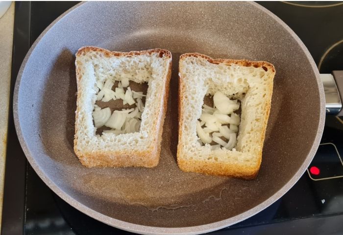 Выкладываем хлеб на сковороду и сразу кладём лук, не не весь, а так, чтобы закрыло дно (примерно по столовой ложке). Лук ещё понадобится.