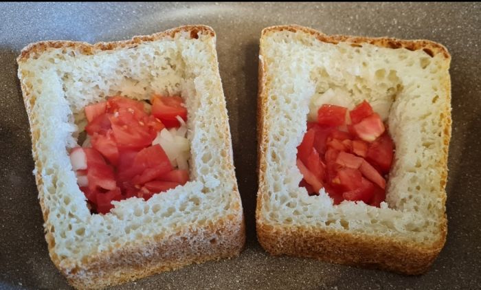 К луку добавляем помидоры (не все, по столовой ложке - нужно место для яйца) и перемешиваем. Сок от помидоров оставляем, им надо будет полить хлеб.