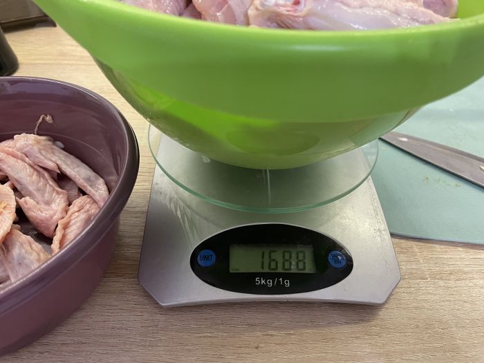 Первым делом отрезаю от крылышек кисти и откладываю в сторону для дальнейшей транспортировки в мусорное ведро. Остальное на весы.
