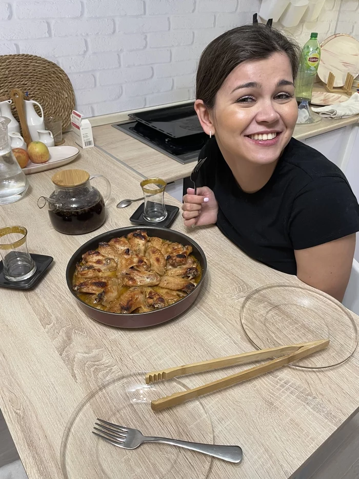 Пока шёл процесс подрумянивания я занялся сервировкой стола. И в этот момент пришла голодная и уставшая женушка, которая знала, что я готовлю крылышки и была очень этому рада.