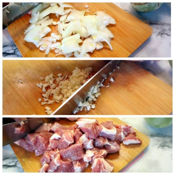 Для начала нам понадобится одна небольшая луковица, пара зубчиков чеснока и конечно же кусочек мяса. Луковицу мы режем четверть кольцами, чеснок измельчаем как можно мельче, можно через давилку. Мясо режем на кубики, у меня килограмм свиной шейки, но Карри еще также делают из курицы.
