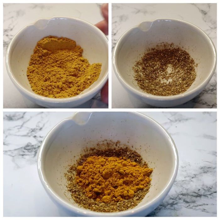 Теперь подготовим специи. Чайную ложку кориандра измельчаем в ступке, к нему добавляем половину чайной ложки сушеного молотого имбиря и полторы столовых ложки приправы Карри, все смешиваем.