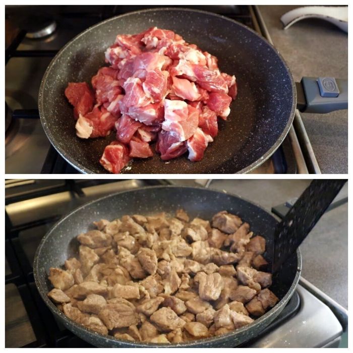 Теперь на раскаленную сковороду, в кокосовое масло, отправляем нашу свинину и обжариваем до тех пор, пока не выпарится вся жидкость.