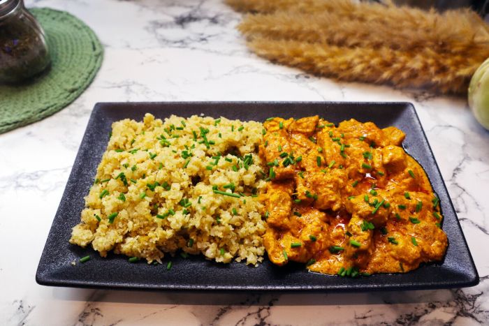 На гарнир у меня будет цветная капуста, я ее поджарила на сковороде с небольшим количеством хмели-сунели и паприки. И вот оно, наше Карри, добавляем немножко свежего лучка и можно подавать к столу!