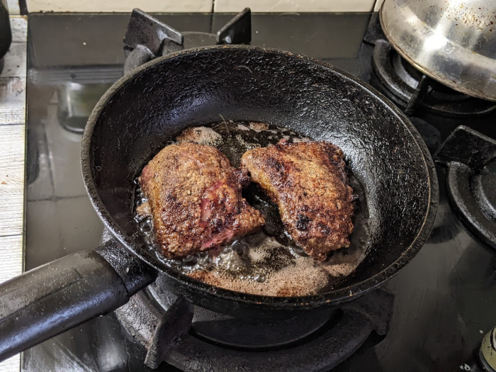 Печень очистила от пленок и протоков, располовинила на два таких лаптя и хорошенько смазала горчицей с обеих сторон. Не спрашивайте меня, в чем колдунство. Печень с горчицей вкуснее, это исторический факт ). Дала полежать 5 минут. Подсолила, посыпала мукой, поджарила на растительном масле с двух сторон на среднем огне до уверенной корочки.