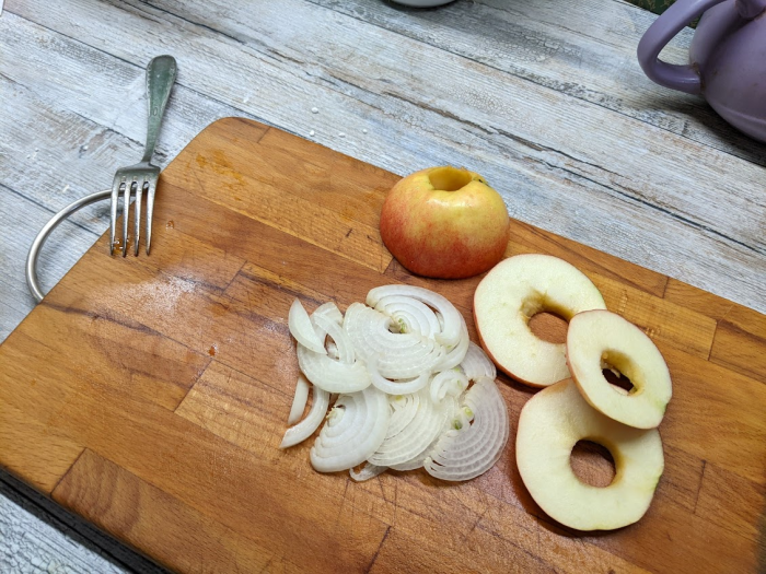 Сок может быть, чуть розоватым, это нормально. Жарить минуты по 3-4 с каждой стороны, иначе будет жесткая. Режем пока лук и яблоко - половинку луковицы полукольцами и яблоко кружками.