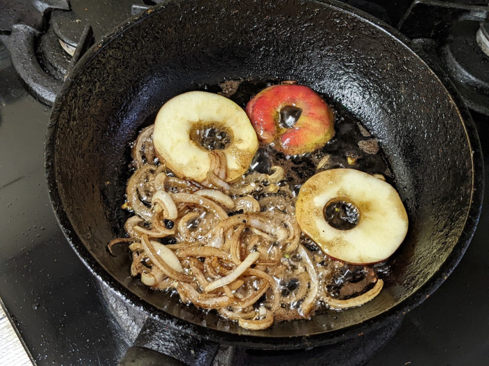 На одну-две порции у меня граммов 300 печени говяжьей, половинка яблока, половинка луковицы. Если порций точно будет две, берите целую луковицу и целое яблоко, я просто поджарила, сколько хотелось.
